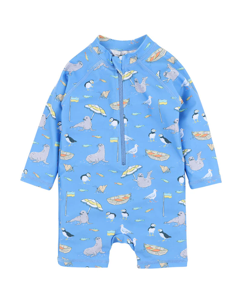 A playful print and a practical design make this long sleeve (UPF 50+ and chlorine resistant) surf suit is perfect for little adventurers who love to splash and explore. With full-length sleeves for added sun protection and a centre front zip for easy changes, this cheerful suit is ready for a day at the beach or poolside fun.