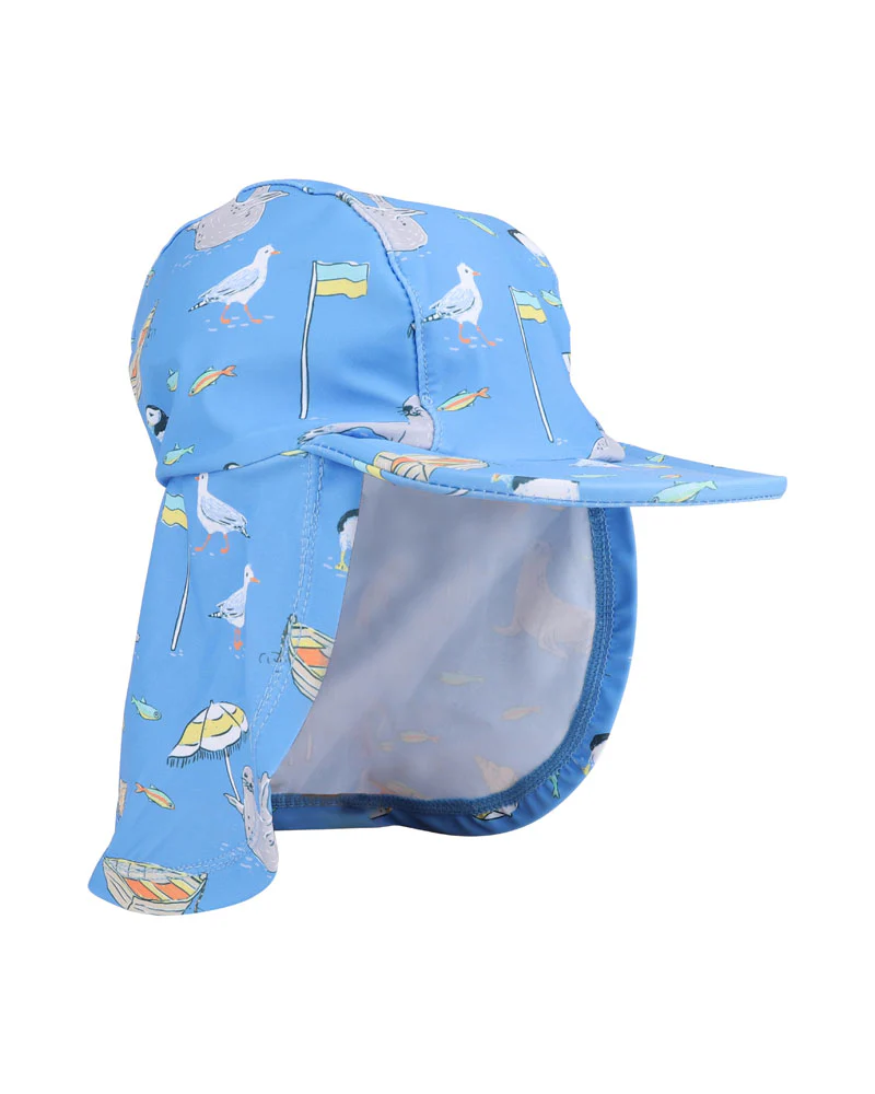 Made for sunny adventures and salty sea days, this legionnaire swim hat keeps little faces and necks protected while they play. Featuring an all-over coastal print of cheerful puffins, sea lions and sailboats, it's as fun as it is functional with a firm peak and flap design offering extra shade for all-day exploring.