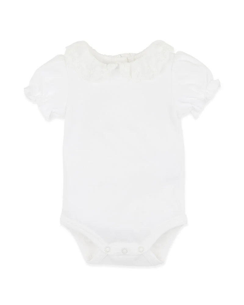 This sweet romper staple with vintage-inspired charm, this lace collar bodysuit is perfect for dressing up your little one with ease. Crafted from soft and breathable 100% organic cotton, it's gentle on delicate skin and just as beautiful layered under rompers, pinafores or worn on its own. The intricate lace collar adds a soft, feminine touch, while puffed sleeves and gathered cuffs bring a timeless silhouette. Thoughtfully designed with a back button placket and handy press studs at the crotch, it's as practical as it is precious.