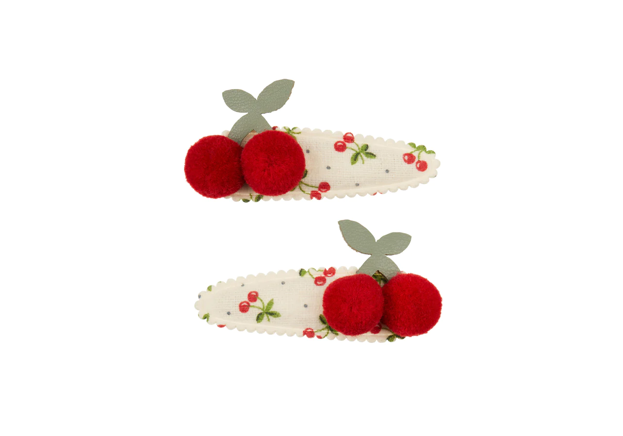 Get fruity with this delightful pack of cherries clic-clacs! 2 in a pack 5cm cherry print fabric covered clic clacs Cherries crafted from pom poms sat atop soft green leatherette fabric leaves