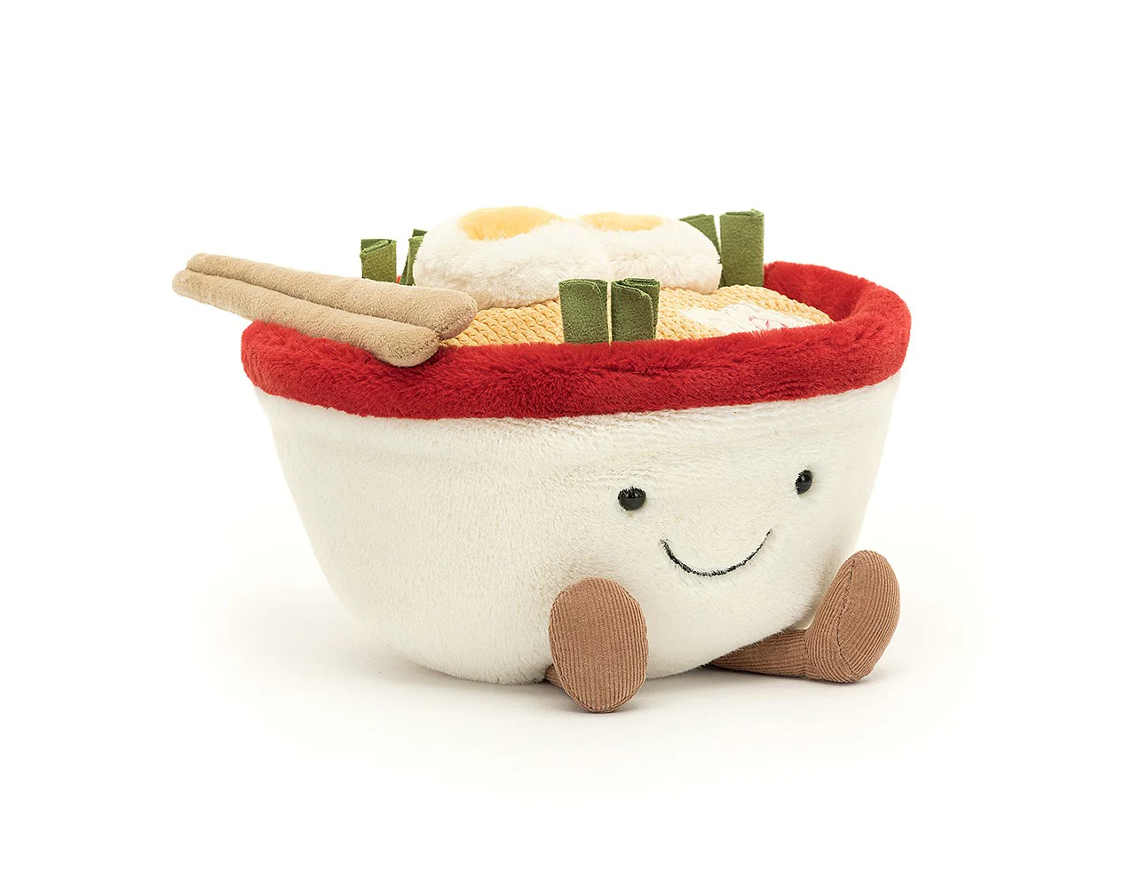 Amuseables Ramen is full of kawaii charm, from the cream-and-red bowl to the suedette chopsticks. Filled with wavy cord noodles, suedette spring onions and fluffy boiled eggs, as well as a pink embroidered fish cake, this dish is a wish come true.