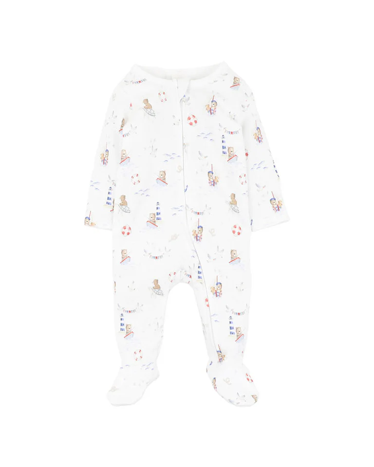 Set sail for dreamy nights and cozy cuddles in this adorable Organic Cotton Zip Romper, featuring the charming Axel nautical print with playful bears, lighthouses, and sailboats. Designed with comfort and practicality in mind, this footed romper features a centre front zip with a protective safety fold, plus fold-over mittens to keep tiny hands warm and prevent scratching. Crafted from soft, breathable Organic Cotton, it's perfect for sleep or play. Match it back with the Axel blanket for a coordinated gift.