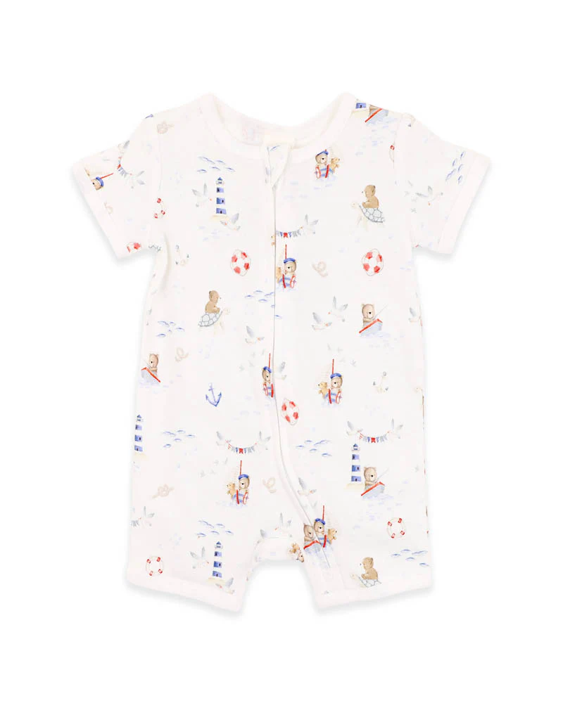 Sail into summer in sweet style with this Organic Cotton Short Sleeve Romper, featuring a whimsical Axel nautical print with playful bears, sailboats, and lighthouses. Soft, breathable, and perfect for warmer days, this romper includes a centre front zip with a safety fold to protect delicate skin, making changes a breeze. Ideal for beach adventures or playtime at home, it's a wardrobe favourite that's both practical and playful. Match it back with the Axel blanket for a coordinated gift.