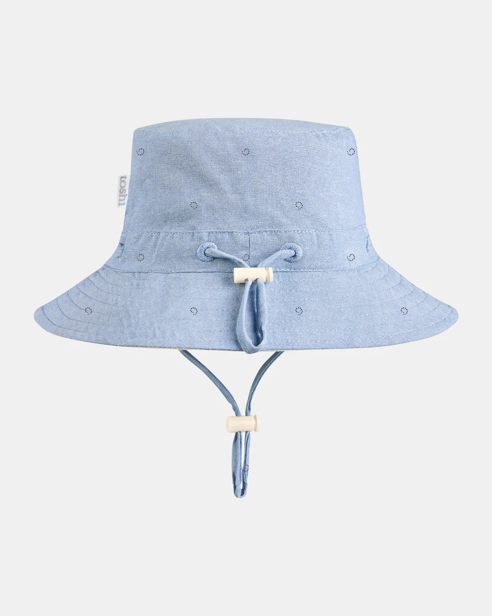 The classic wide brimmed Toshi sunhat features a subtle print design. A toggle on the head tie creates adjustable sizing and the chin tie with toggle secures the hat and offers ease of wear. Made from a durable and quality cotton fabric.
