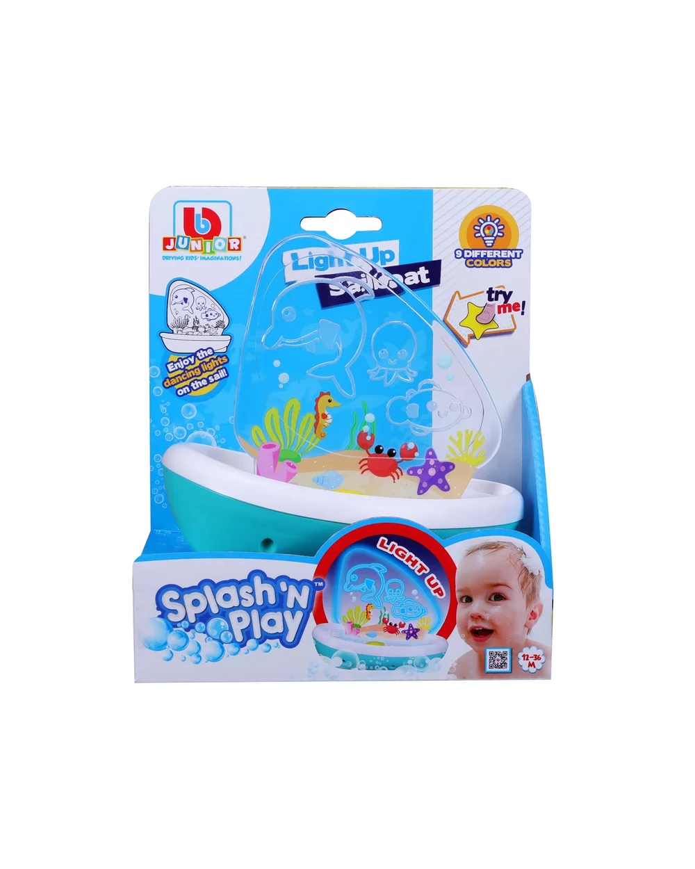 Another new addition to the Splash 'N Play lineup, the Bb junior Light-Up Sailboat! Press the button to illuminate the clear sail. Cute and playful sea creatures will light up the sail while floating in the tub or pool. Kids will enjoy the beautiful colors and dancing lights on the display for fun water play.